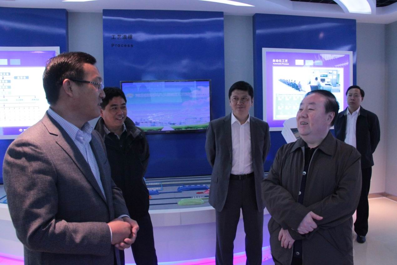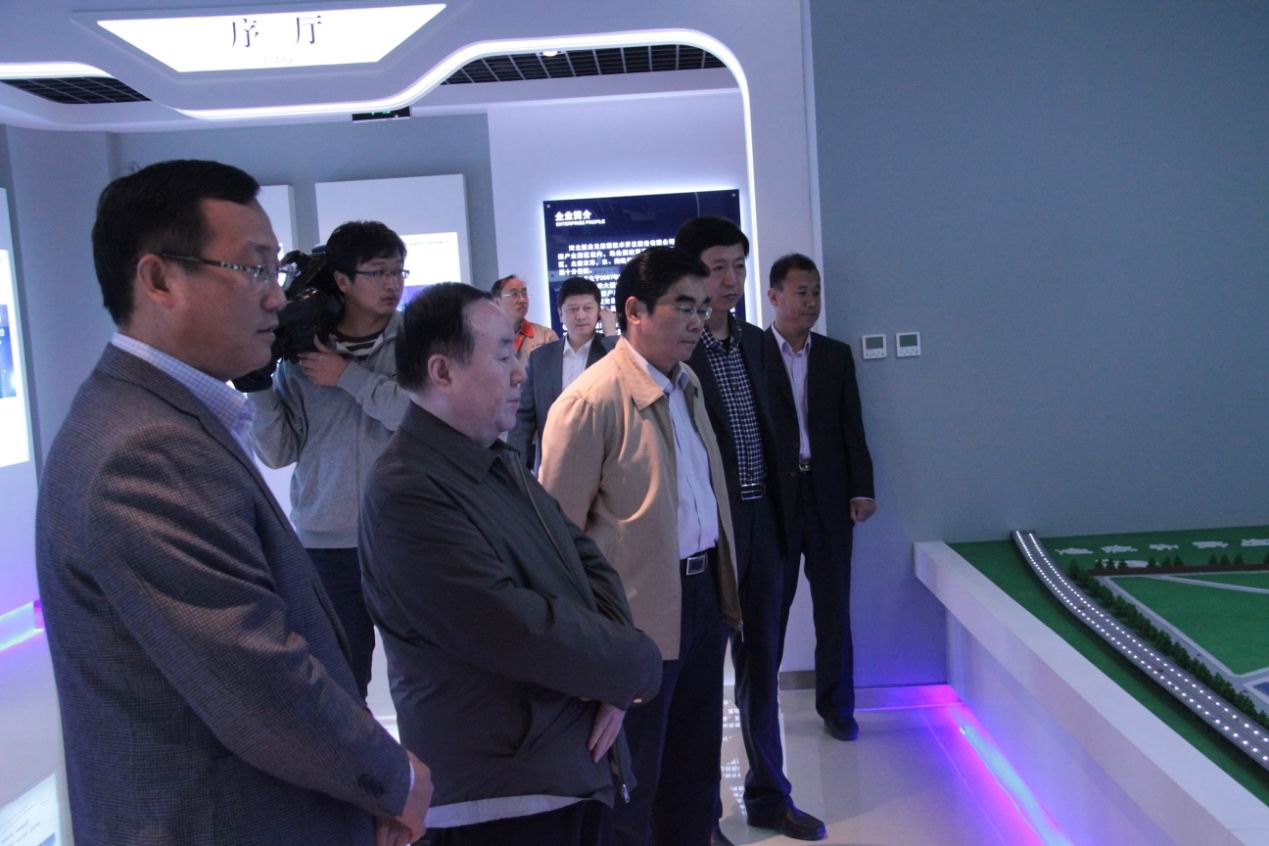 趙主席一行首先參觀了科研樓展廳,解說員向來訪領導著重介紹了公司現狀和公司理念等內容,在公司裝置沙盤前,集團于總就公司規模、年產值、未來規劃等內容向來訪領導作簡單介紹。