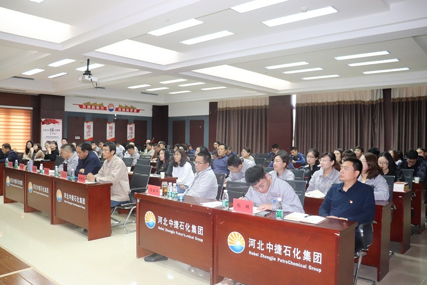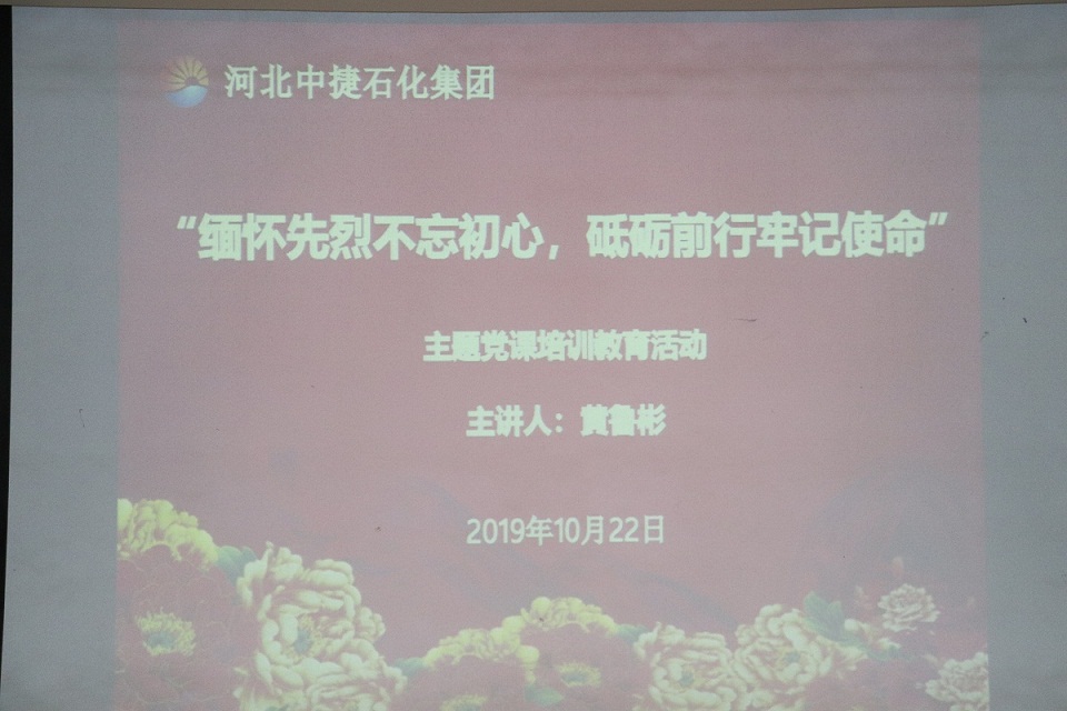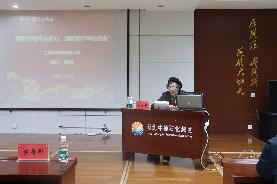 為緬懷革命先烈功績,弘揚革命傳統精神,激發廣大黨員干部愛國主義、集體主義精神和社會主義道德情操風尚,培育和踐行社會主義核心價值觀,增強廣大黨員干部干事創業的向心力和凝聚力,10月22日,集團黨委在科研樓六樓會議室組織開展2019年“緬懷先烈不忘初心,砥礪前行牢記使命” 主題黨課培訓教育活動,特邀抗戰英雄黃驊之女黃魯彬女士為大家授課,集團公司總經理喬樹華,黨委副書記朱振江、黨支部委員,黨建共建單位中海石油中捷石化有限公司黨員代表、集團各單位黨支部書記、工會主席、黨員代表、黨務工作者共計70余人參加活動,中捷產業園區黨群工作部孟輝部長、組宣部黨員代表出席了本次活動。