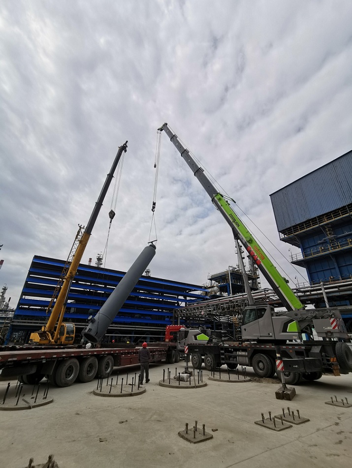 3月31日上午9時,伴隨著指揮人員的一聲哨響,“吸附塔”在兩臺吊車的默契配合下平穩起升,回轉、直立、就位一系列動作嫻熟準確,8臺“吸附塔”在2天內相繼完成吊裝,順利完成了該項目建設的關鍵節點。此項目建成后可回收氫氣5500Nm3/h,為加氫裝置用氫提供保障。
