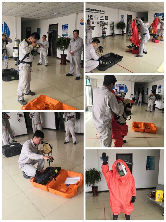 安全比武活動內容分別為空氣呼吸器穿戴及防護服穿戴,此活動重點檢驗員工對應急器材的掌握情況,以及在突發應急情況下快速準確穿戴防護用品的能力。比賽期間,參賽選手緊抓比賽要點,梳理檢查、佩戴、調整、確認四個操作環節,不時對佩戴技巧和要點難點進行交流,共同探討如何提升安全技能水平。