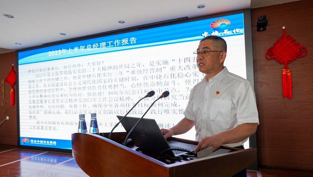 集團公司訊 7月16日上午,河北中捷石化集團2023年上半年工作會議在新啟元科研樓六樓會議室召開,集團公司董事長王振華,黨委書記于國臣,總經理喬樹華,以及集團公司各主管領導,各所屬單位管理人員共計70余人參加了此次會議。會議由集團黨委書記于國臣主持。