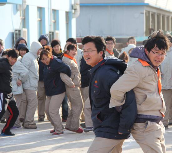 上午9時,在凜冽的寒風(fēng)中,伴隨著一聲號響,大賽拉開帷幕。心心相印(背夾球)、三人四足等既考驗團隊協(xié)作能力又極富樂趣的項目相繼進行。員工們在歡聲笑語中感受著新春的喜悅,在一次次跌倒又爬起的堅持中點燃永不服輸?shù)亩分荆诨咏涣髦性鲞M了配合的默契……