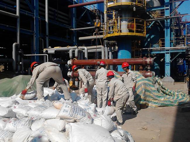 2013年8月20日上午, 新啟元PSA制氫裝置催化劑和填料充裝現(xiàn)場,參加施工的人員正有條不紊的開展工作。一組負(fù)責(zé)將庫存裝車;二組負(fù)責(zé)卸車;三組負(fù)責(zé)開啟密封;四組負(fù)責(zé)裝入吊籃;五組負(fù)責(zé)填充塔器;六組負(fù)責(zé)現(xiàn)場清理;七組負(fù)責(zé)食品和引用水保障。
